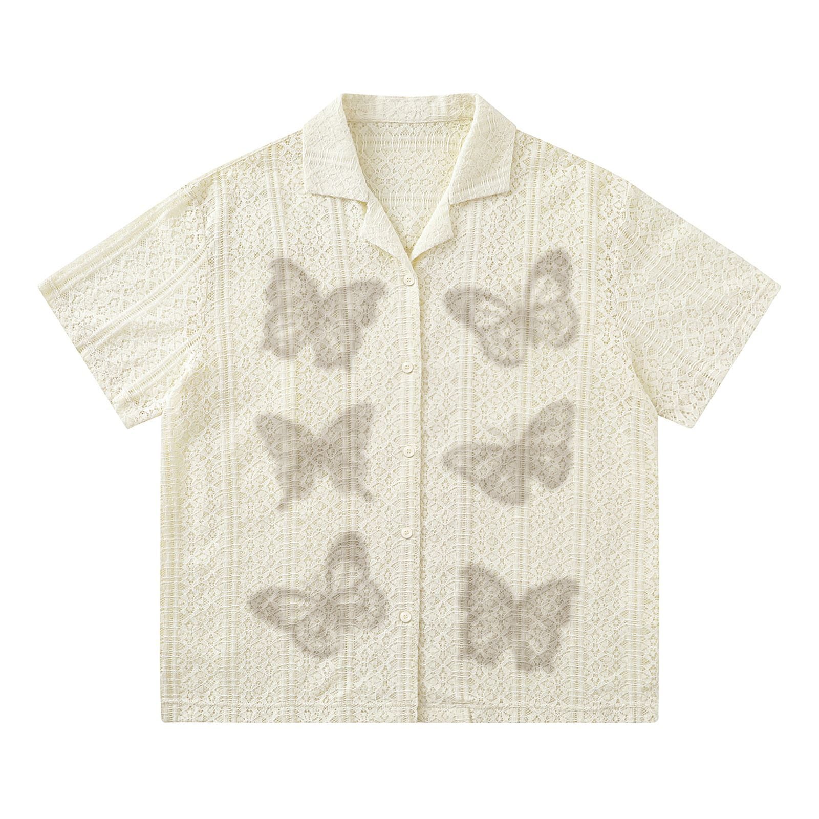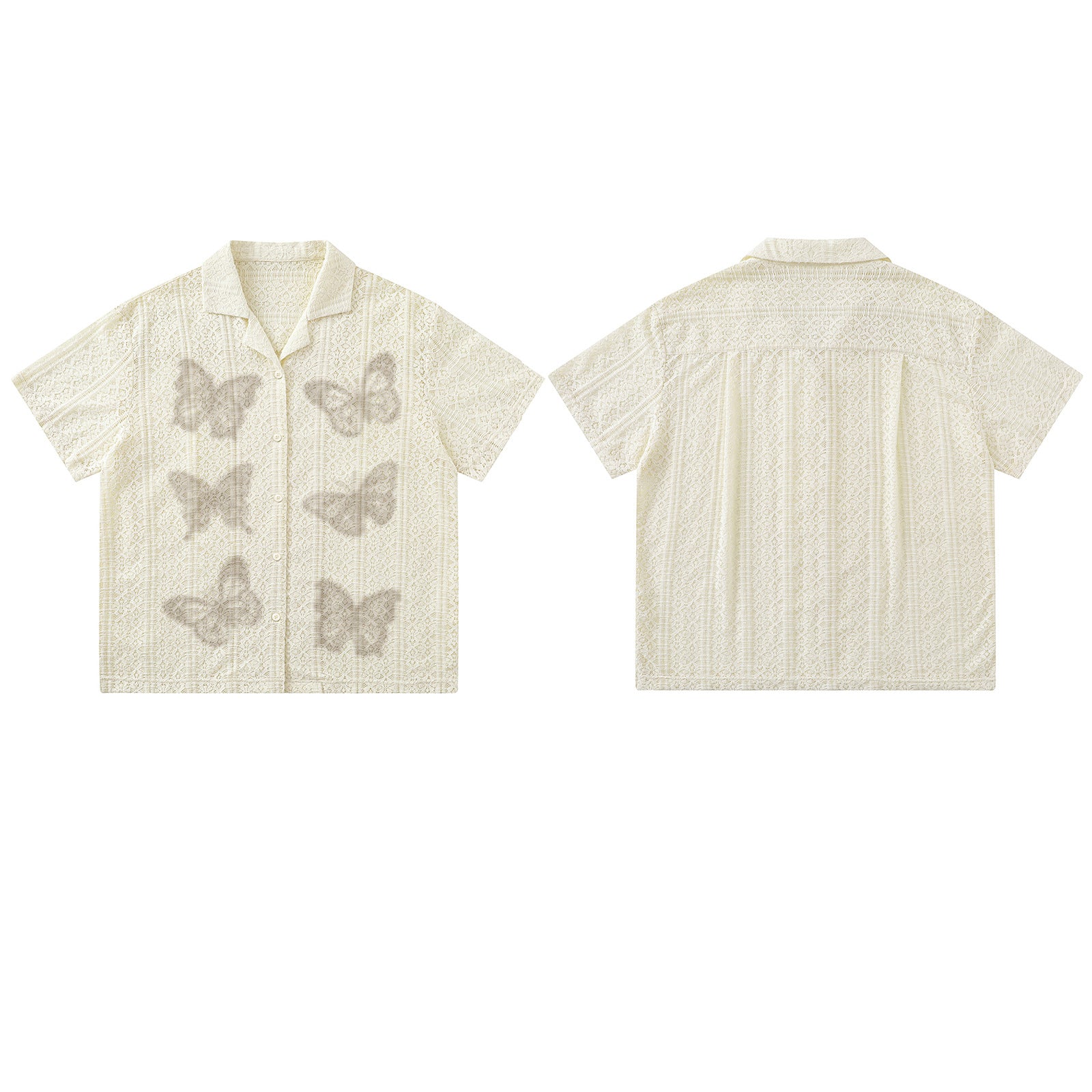 Hollow-out collar and retro butterfly print. Relaxed cut and soft fabric.