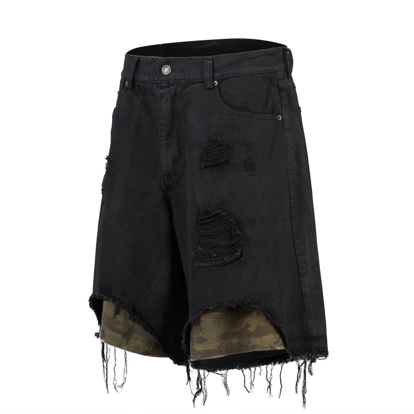 Faded patchwork denim with distressed texture. Strong design for a bold, masculine profile.