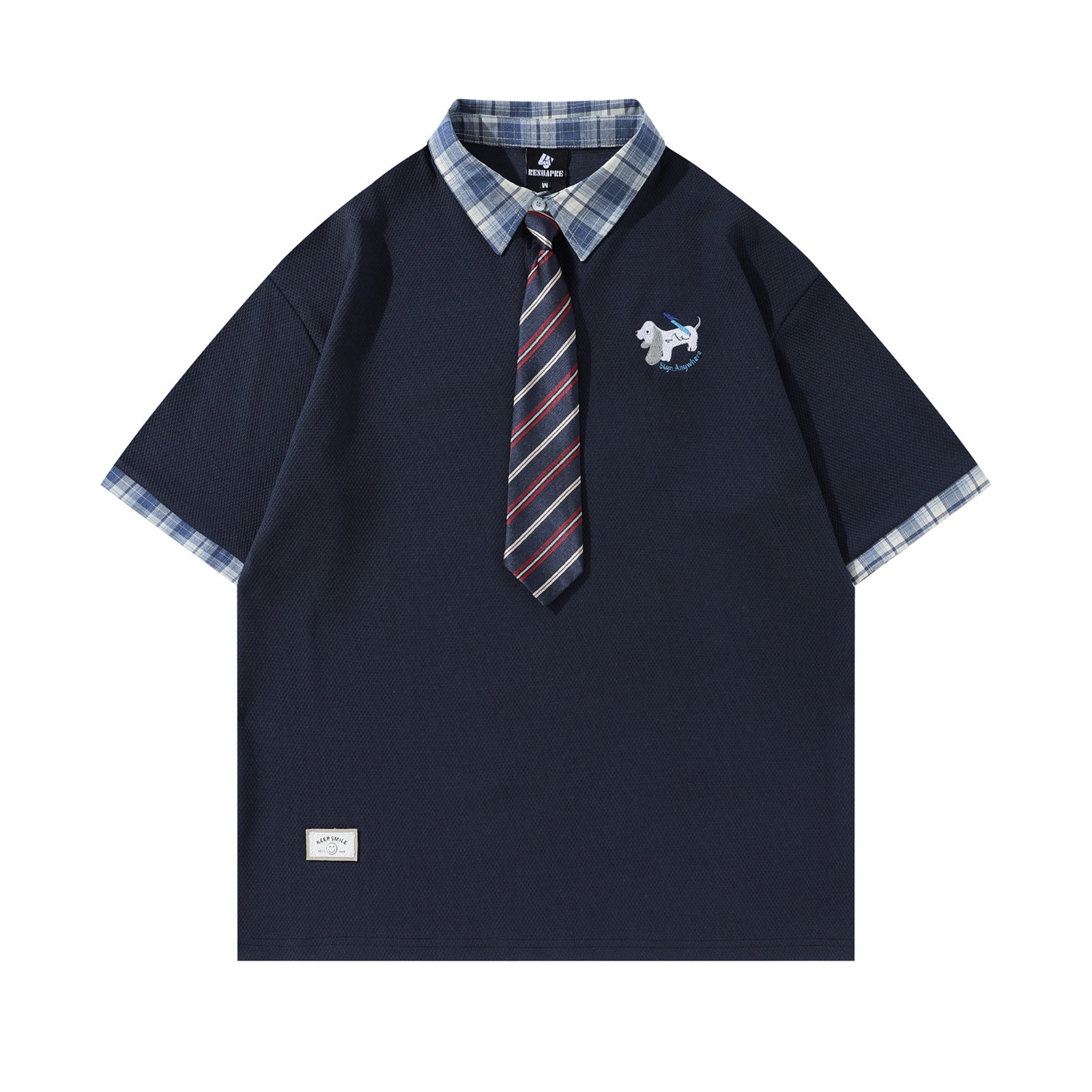 Preppy energy with a detachable tie collar—laid-back layering with smart lines.