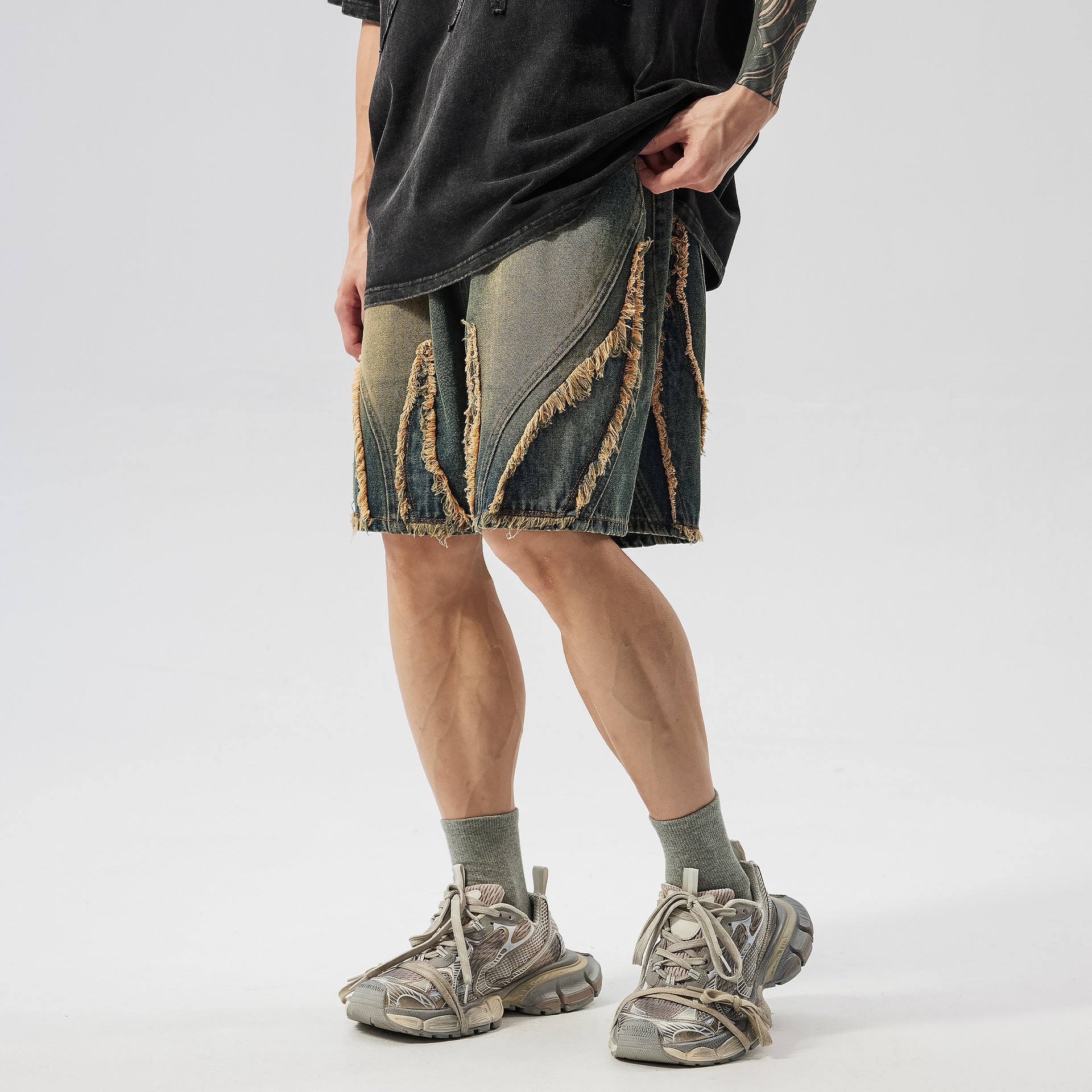 Distressed denim shorts with frayed hems. Rugged tone, relaxed feel.