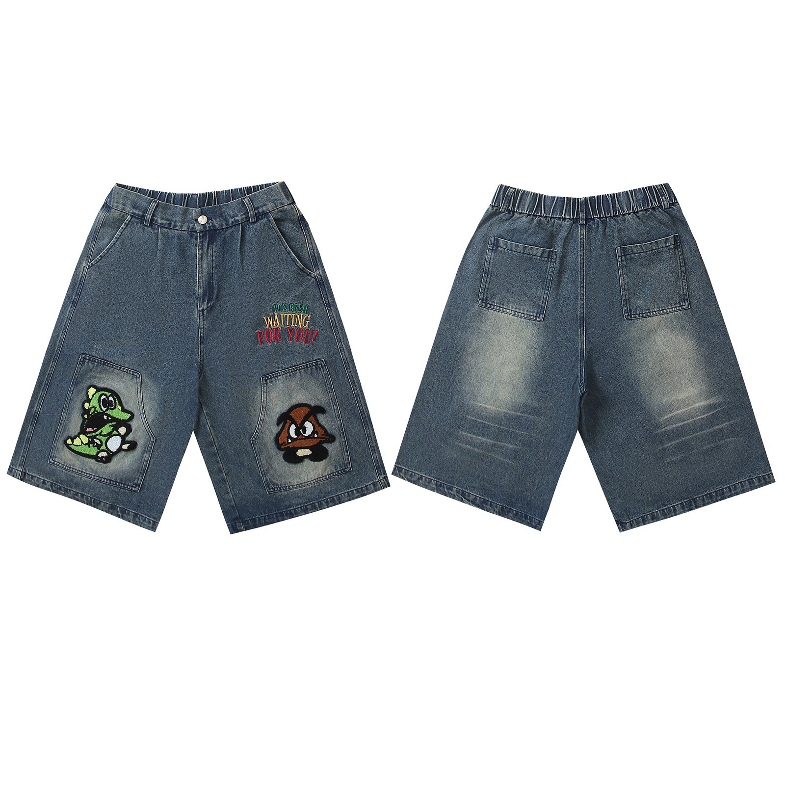 Soft-washed denim shorts with stitched cartoon style—laid-back and standout.