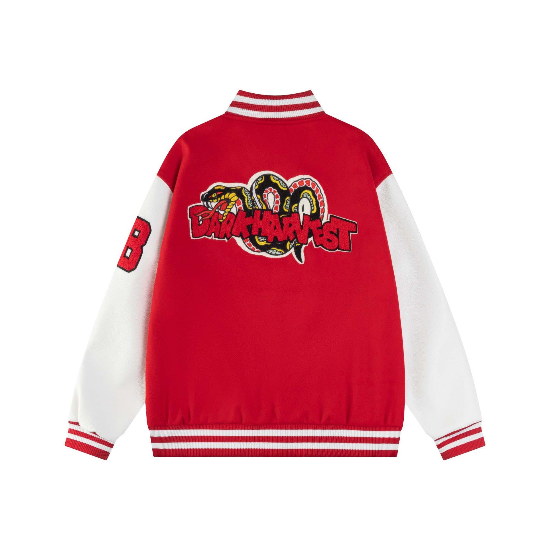 Color-blocked PU leather with embroidered details. A standout piece that combines edge and precision.