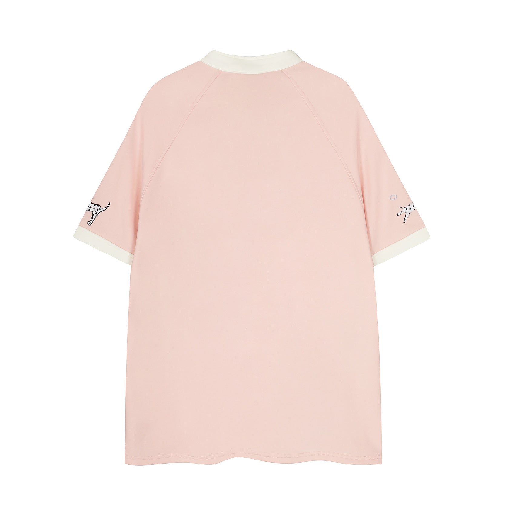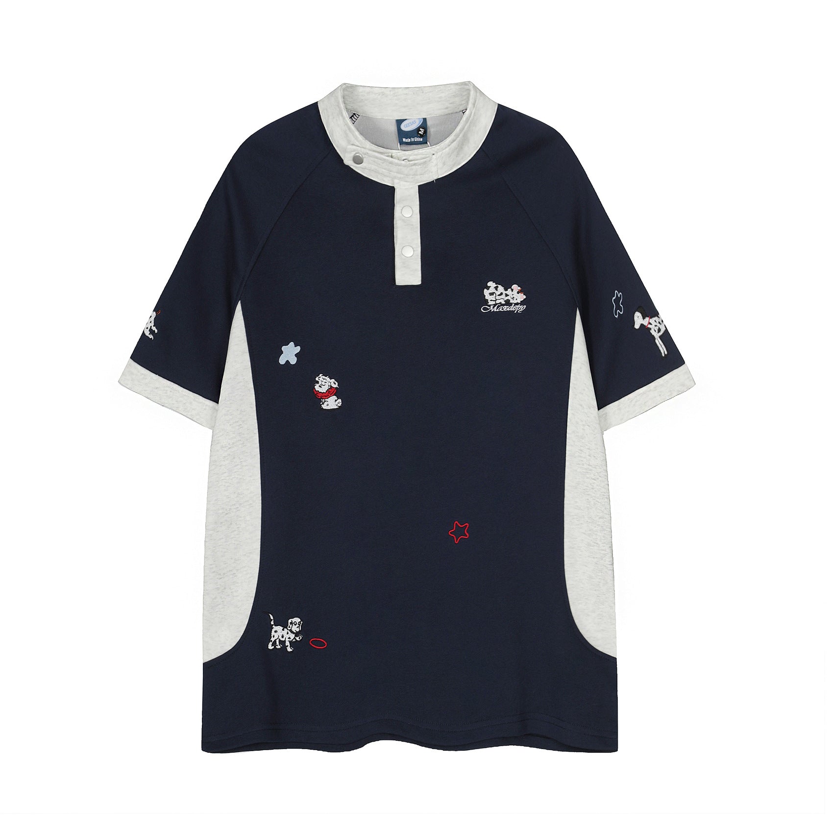 Embroidered dog motif on a stand-collar short sleeve. A statement in playful confidence.