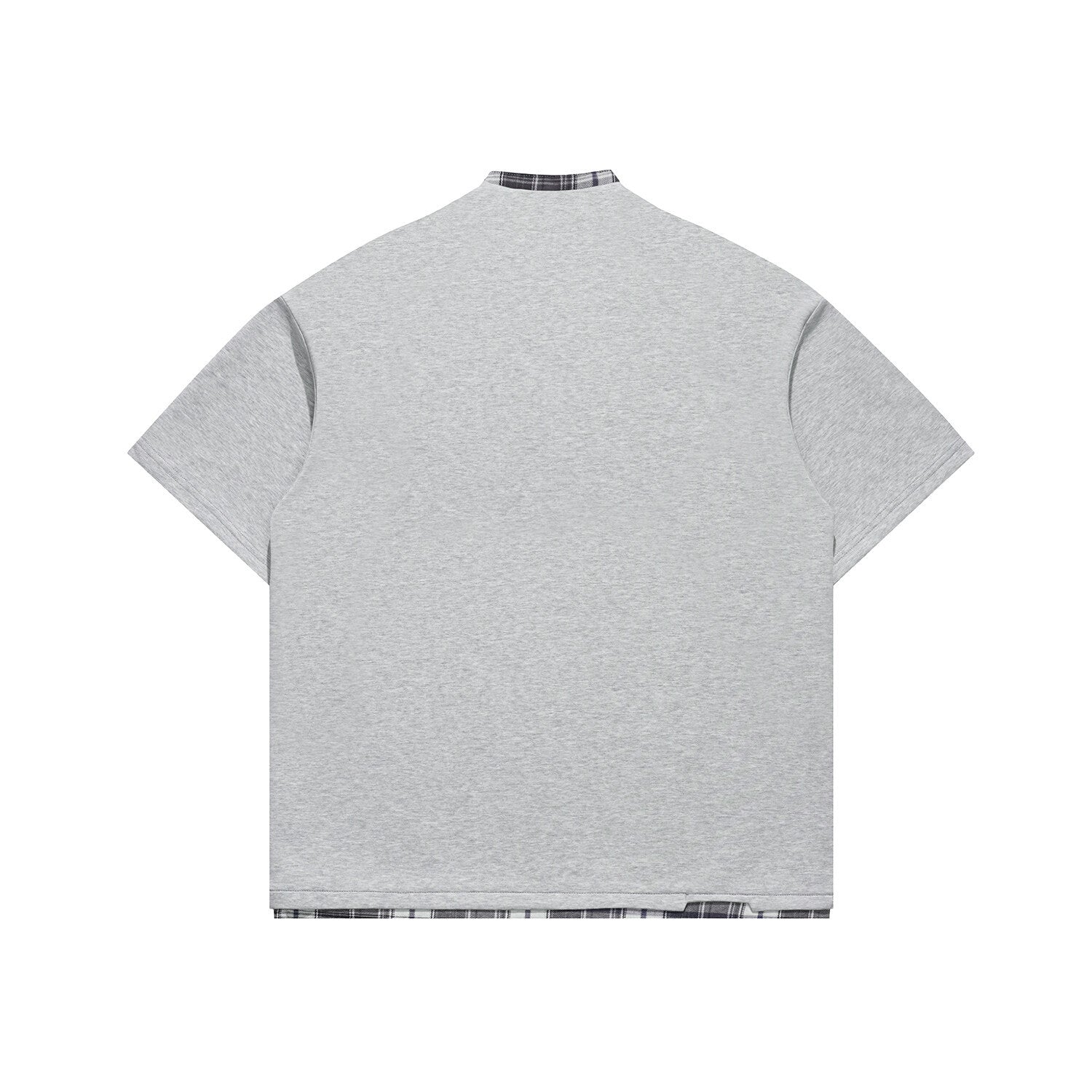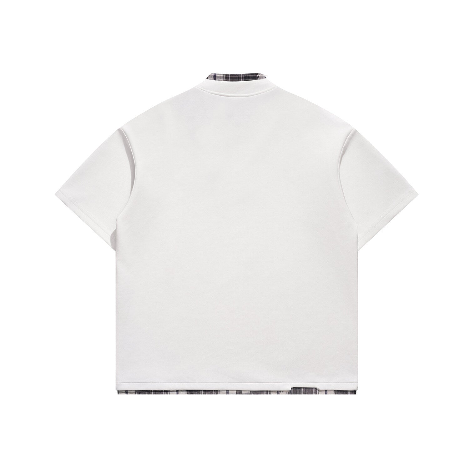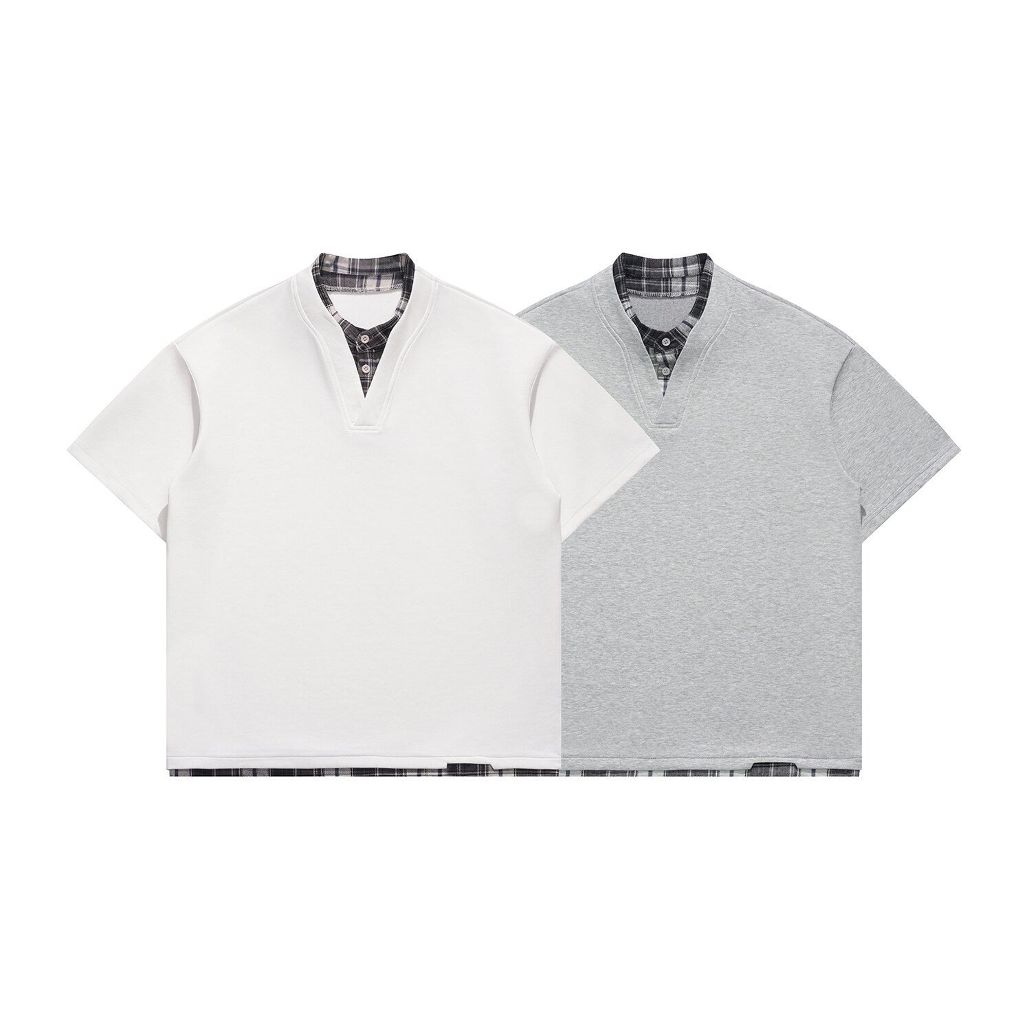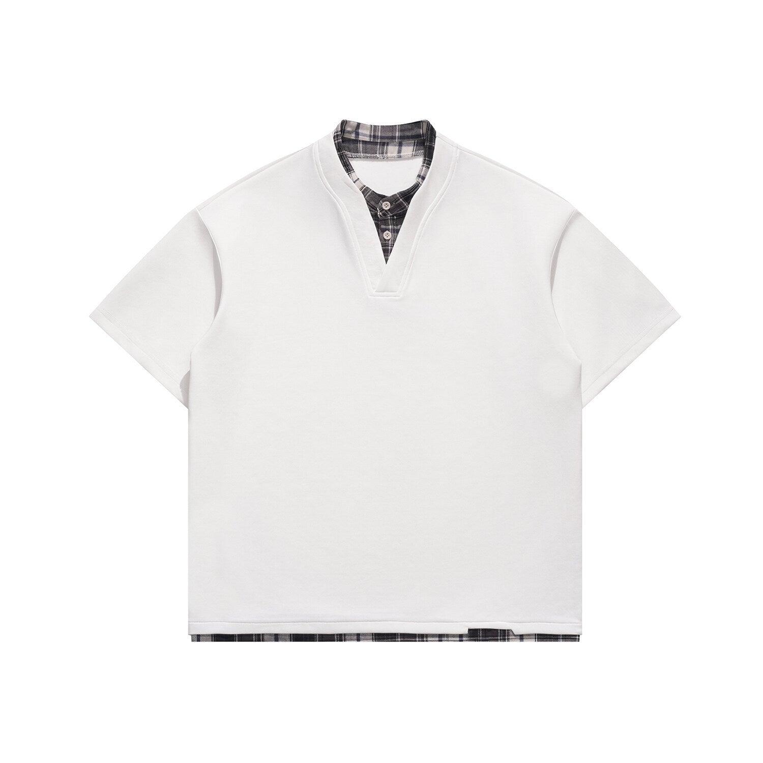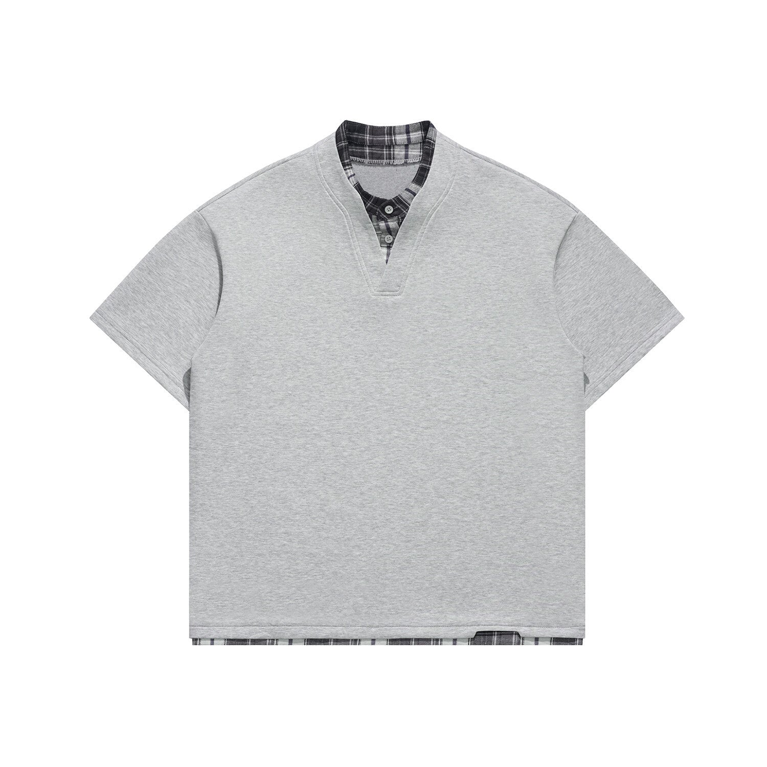 Faux-layered Henry collar over check blocks—contrast meets comfort.