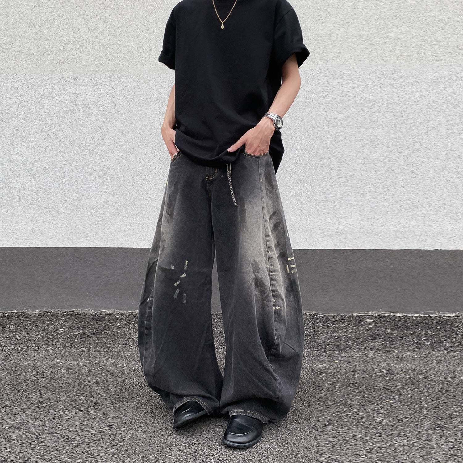 Artistic ink splash denim with faded gradient effect—creative legroom.