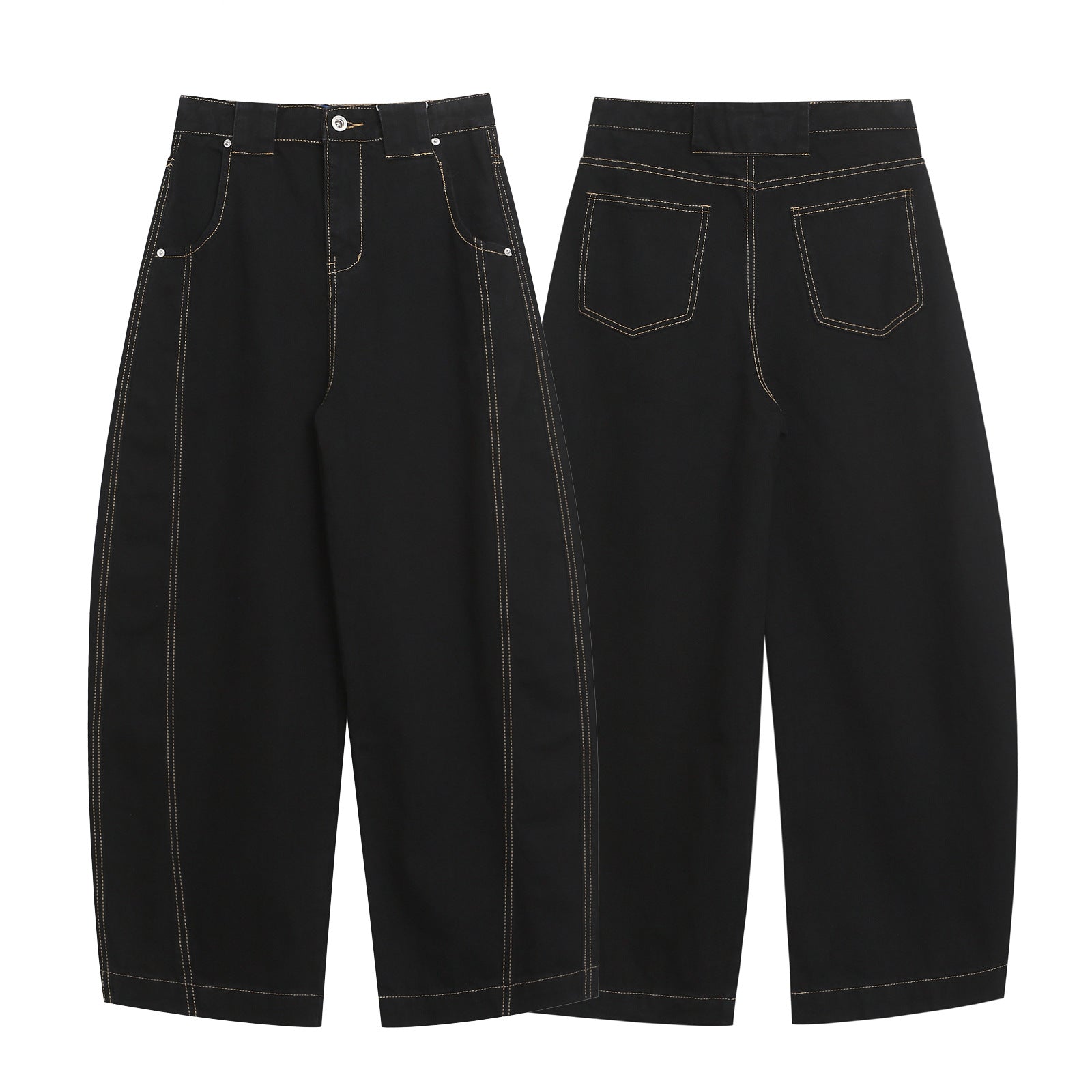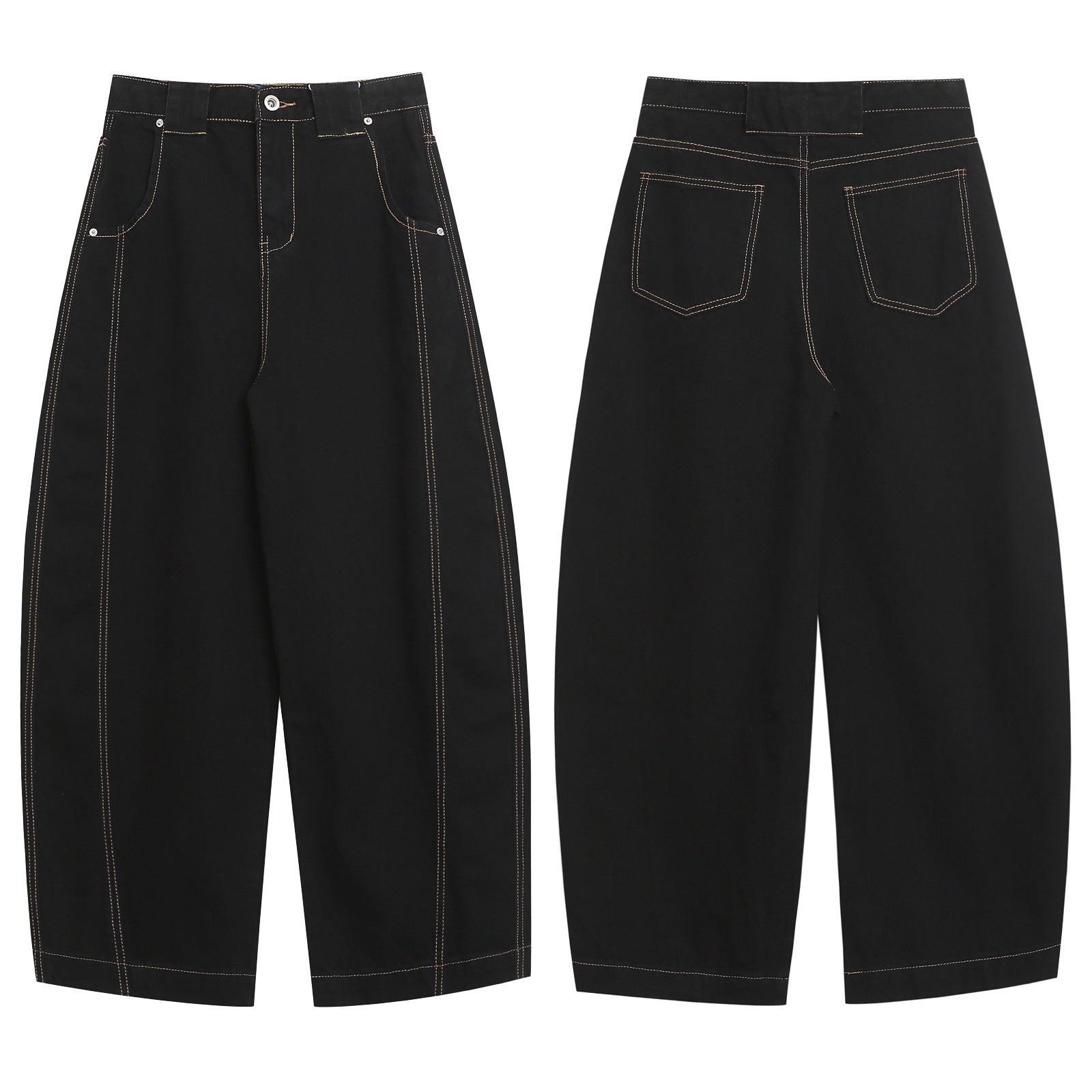 Wide-leg retro denim with knife-edge panels and raw contrast—unique and wearable.