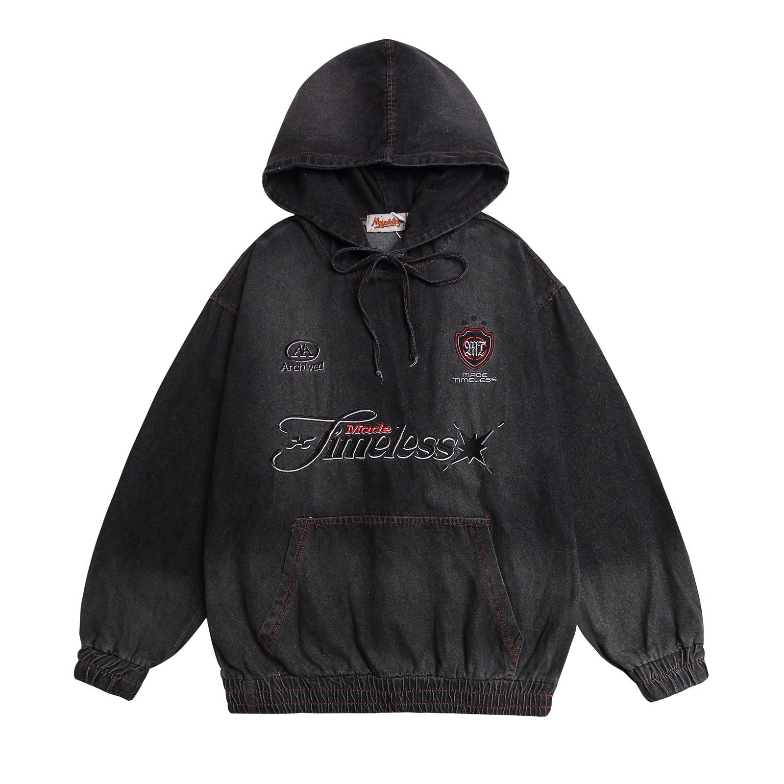 Washed denim construction blended with fleece comfort and bold embroidery.