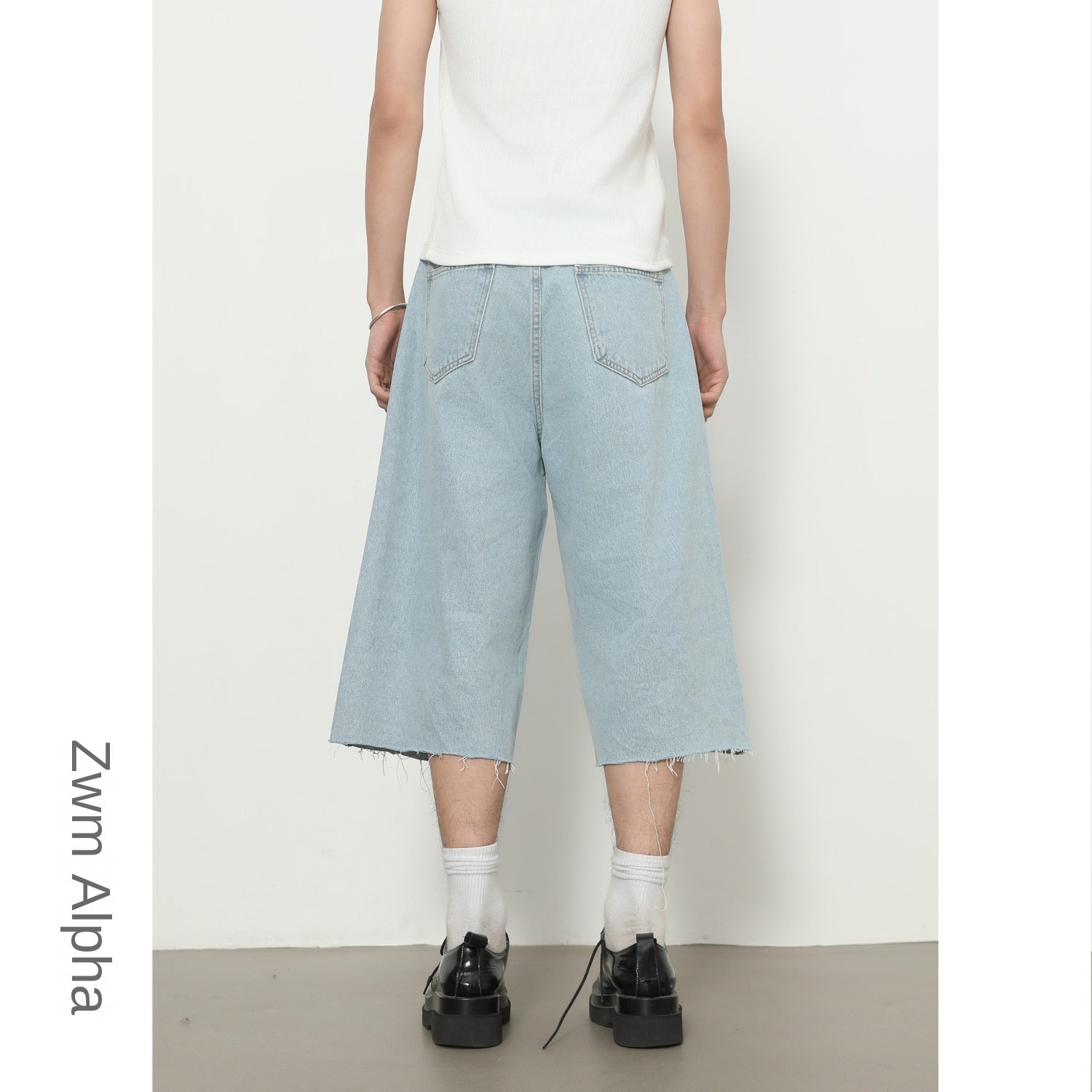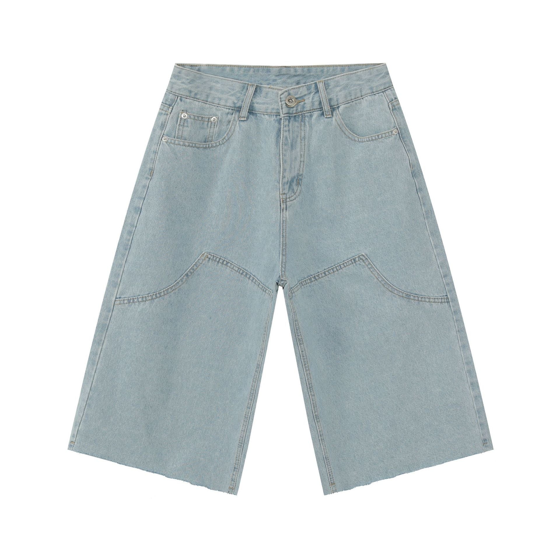 Straight-leg denim shorts with retro build and mid-length sharpness.