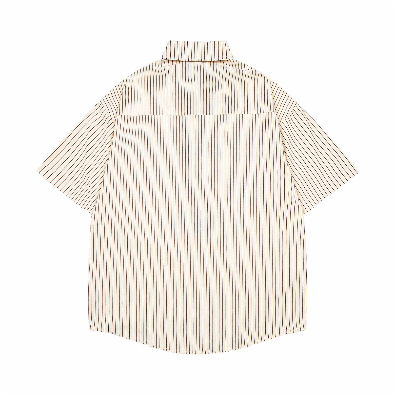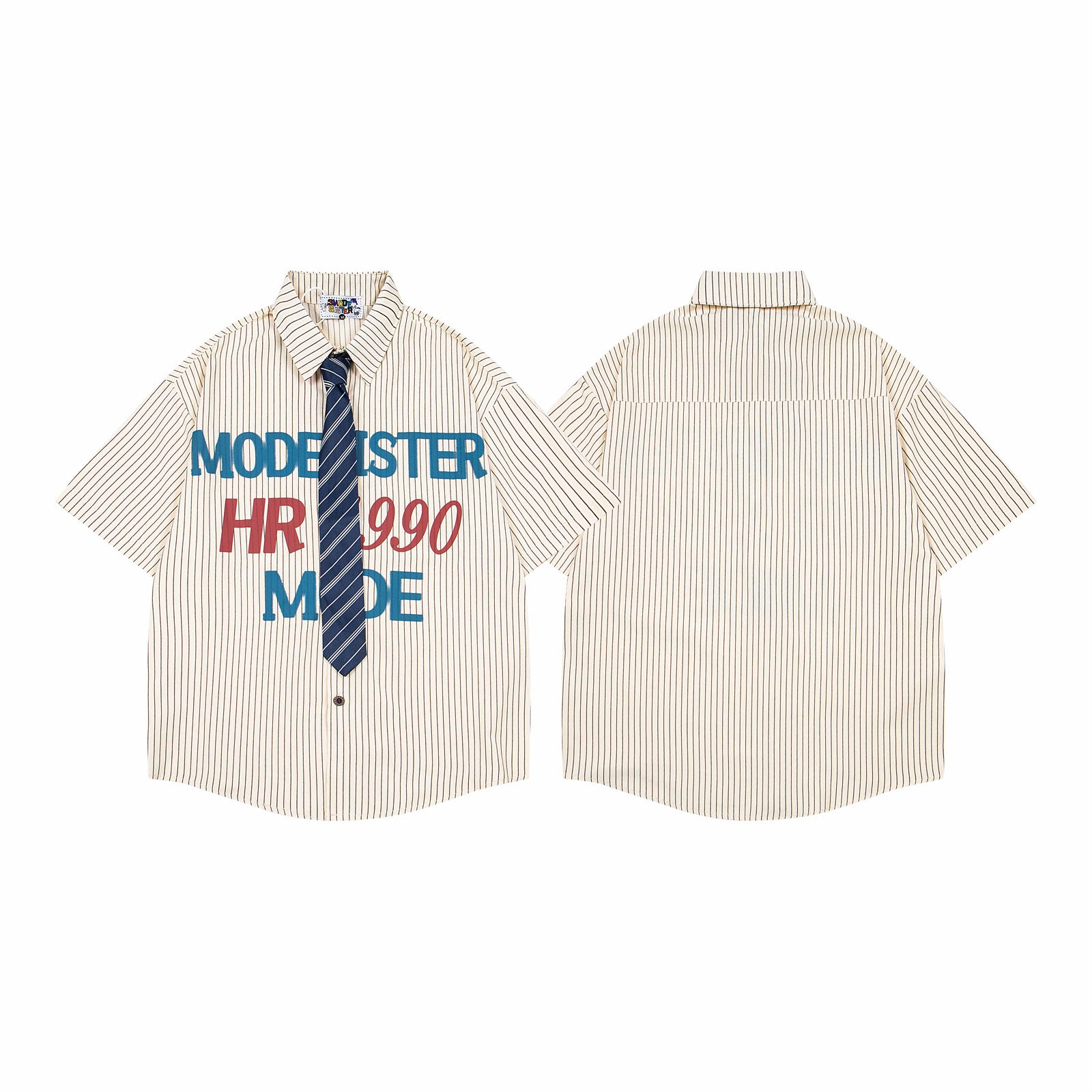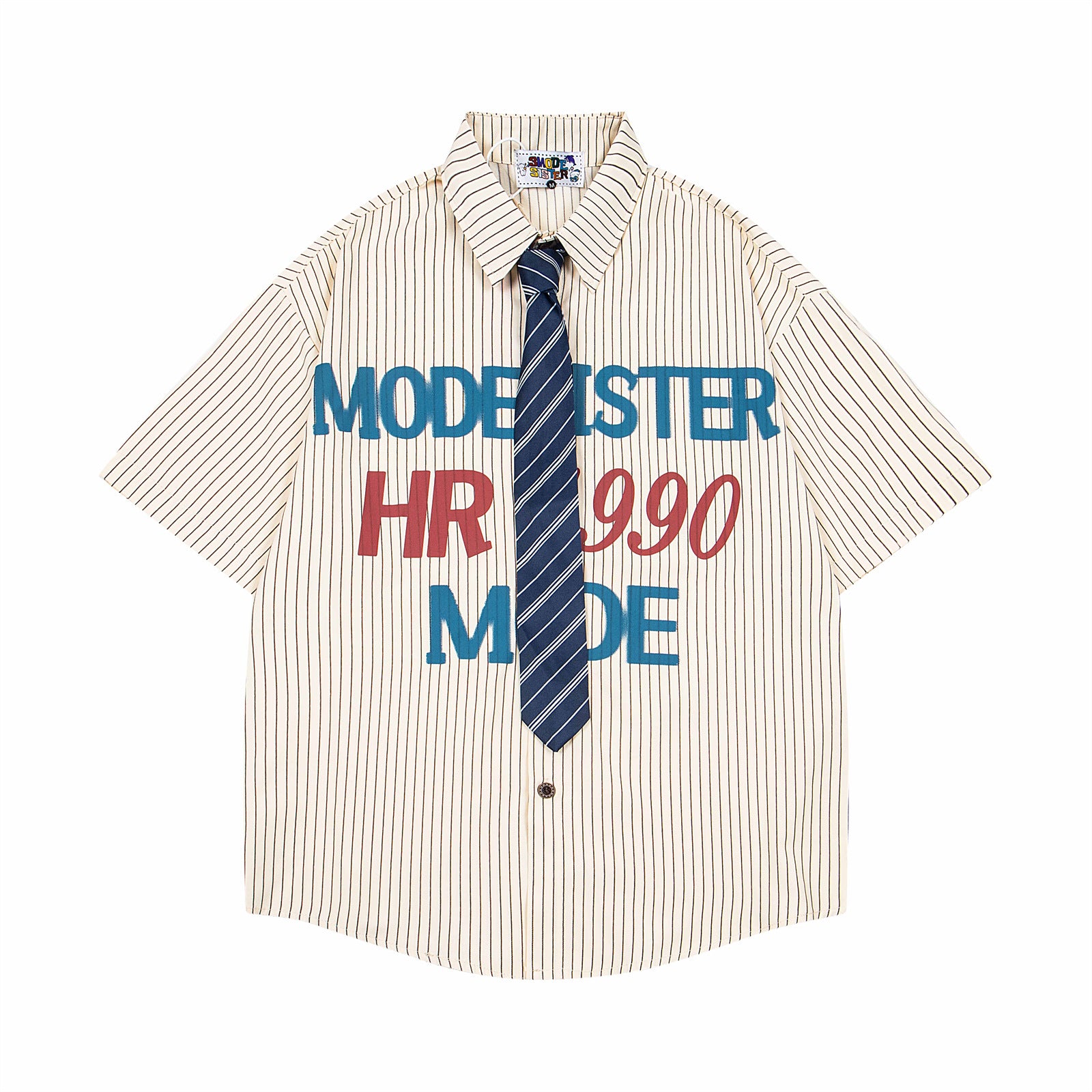 Letter print meets sharp striped collar—summer cut with subtle schoolyard edge.