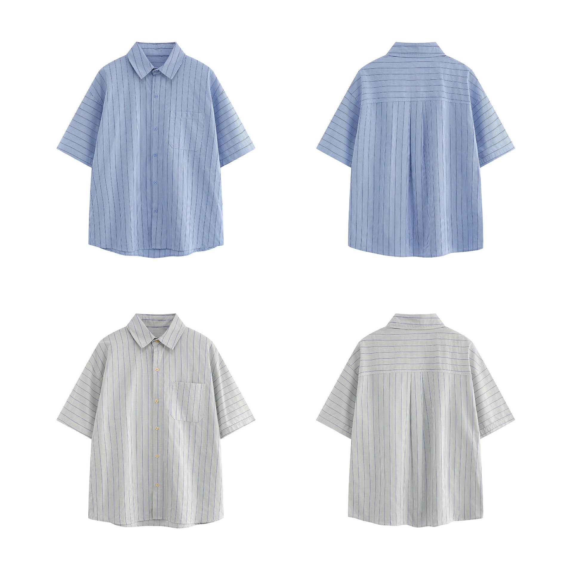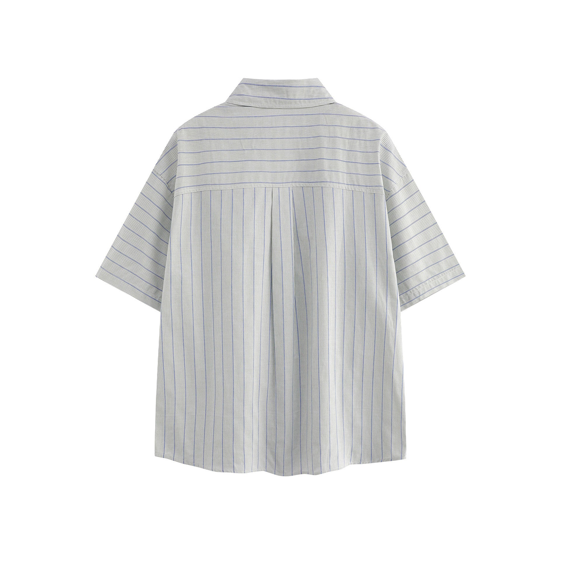 Loose stripes patched with contrast blocks for quiet visual punch.